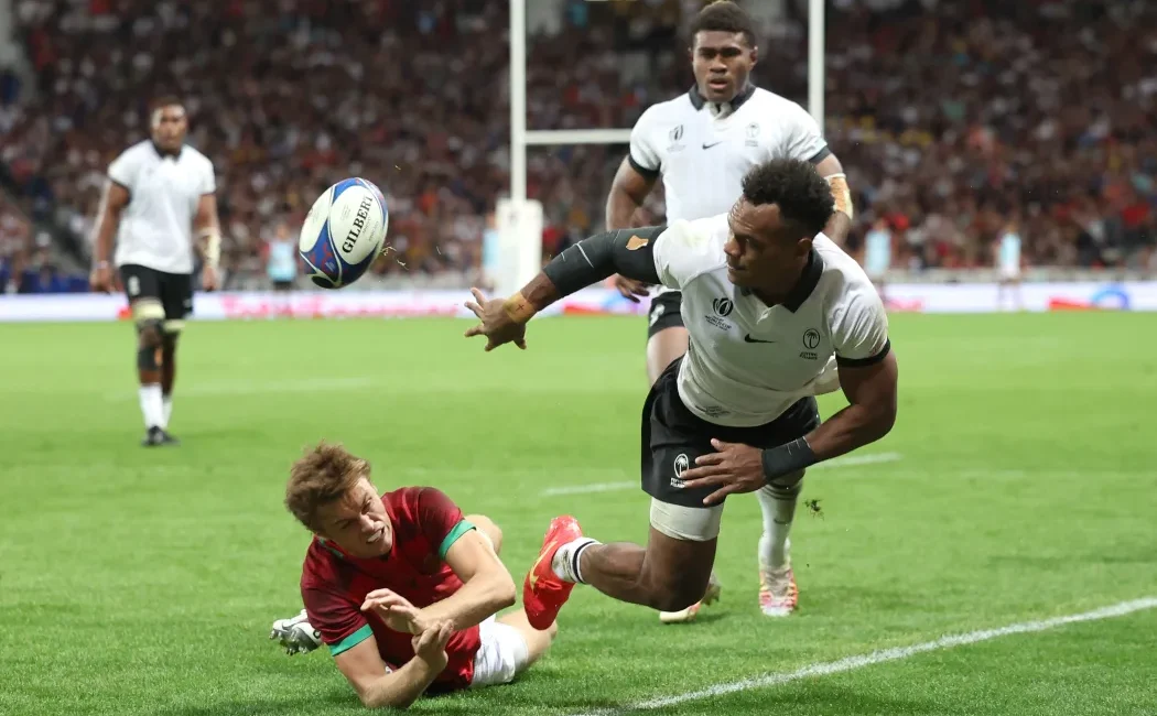 Fiji's full back Sireli Maqala (right) passes the ball ahead of Portugal's fly-half Jeronimo Portela (left) during the France 2023 Rugby World Cup Pool C match between Fiji and Portugal in Toulouse. Photo credit: AFP.