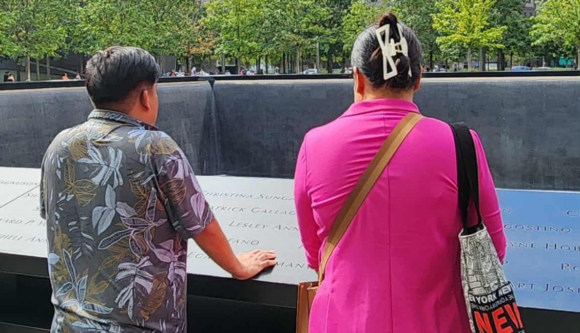 Young Pacific Leaders Alumni Lawrence Jay Alcairo and Simata E La’a Palu reflect at the 9/11 Memorial Pools in New York City.